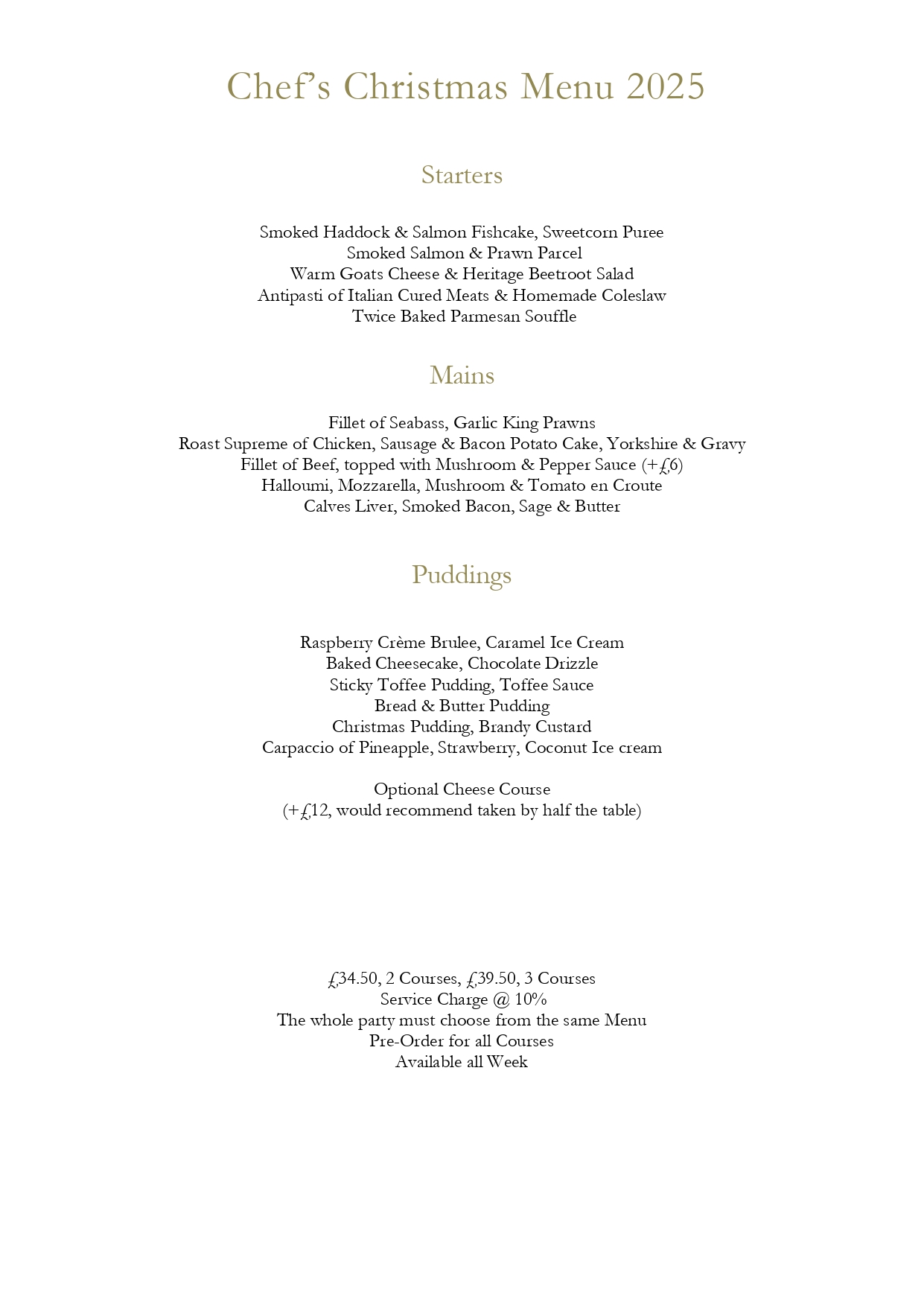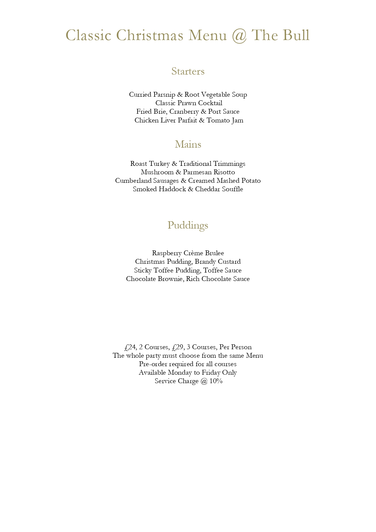 Available Monday to Friday, with pre-orders required, a 10% service charge, and all guests dining from the same menu. Make your Christmas unforgettable at The Bull, where festive flavours and a warm seasonal atmosphere await. βοΈπ